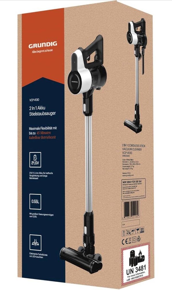 Ontdek de kracht van efficiënt schoonmaken met de Grundig VCP 4130 2-in-1 steelstofzuiger Deze zakloze stofzuiger in stijlvol zwart en wit biedt maximale flexibiliteit dankzij het draadloze ontwerp en variabel vermogen Met een krachtige lithiumion accu van 216 V en een looptijd tot 45 minuten heb je altijd voldoende tijd om je huis grondig te reinigen